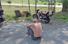 Ondra s Milanem se vypařili aniž bychom si toho všimli. Přetlačili jsme motorky k zahrádce a vydatně posnídali. Vedle motorek zůstala dvě parkovací místa volná, přesto na bližším zaparkoval majitel kempu a při vystupování z auta si dal záležet aby dveřmi svého otřískaného tranzitu otřískal i jednu z našich motorek. Povedl se mu pěkný šrám na předním blatníku a masce. Místo omluvy řekl jen, že máme být rádi, že nám je neshodil. 7 zemí jsme projeli a na největšího blba narazíme doma. V tomto kempu už mě nikdo neuvidí. S radostí jsme kemp opustili a vyrazili k Brnu a domů. Roman opět zadřel a motor přidal na hlučnosti. S Pavlem si vyměnil motorky a dlouho na ní nevydržel. Motorka neměla výkon a strašlivě řínčela. Po několikakilometrovém utrpení se motor rozhodl definitivně zastavit u města Kralice nad Oslavou. Už jsme ho nerozhýbali. Roman si zařídil odvoz a my jsme zde již byli zbyteční a jeli jsme tedy bez něj. Najednou jsme to hnali mnohem rychleji než celé dny dříve. Další zpestření naší cesty bylo u Vyškova, kde na nás čekal kamarád Tomáš, který nám přijel naproti z Opavy. Jeli jsme kolem dálnice a rozestavěný kruhový objezd jsme projeli přímo přes staveniště. Na nějaké objížďky jsme už neměli náladu. Domů jsme přijeli kolem 18-té hodiny, kde nás už všichni čekali. Roamn na vozíku a kolem půlnoci.